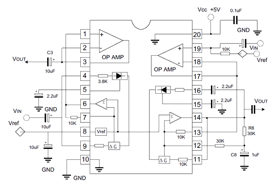 UTC575是一個(gè)專(zhuān)為低壓應(yīng)用設(shè)計(jì)的精密的雙增益控制語(yǔ)音壓擴(kuò)電路。它的一個(gè)通道可應(yīng)用于擴(kuò)展器,另一個(gè)通道既可以應(yīng)用于擴(kuò)展器、壓縮器又可以應(yīng)用于自動(dòng)電平控制,內(nèi)含整流器、可變?cè)鲆鎲卧?、運(yùn)算放大器等電路,適用于無(wú)線麥克風(fēng)、無(wú)線電話等設(shè)備中作語(yǔ)音壓縮與擴(kuò)展。